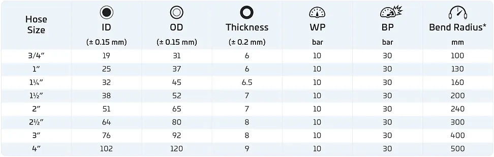 * Bend radius values are for outer smooth hoses with spiral steel wire reinforcements.