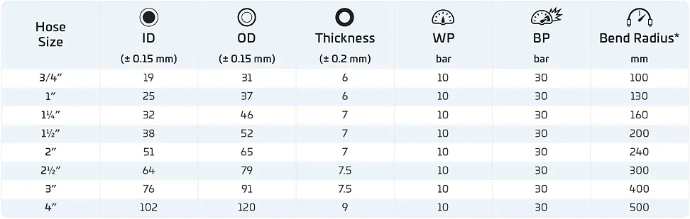 * Bend radius values are for outer smooth hoses with spiral steel wire reinforcements.