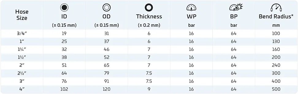 * Bend radius values are for outer smooth hoses with spiral steel wire reinforcements.