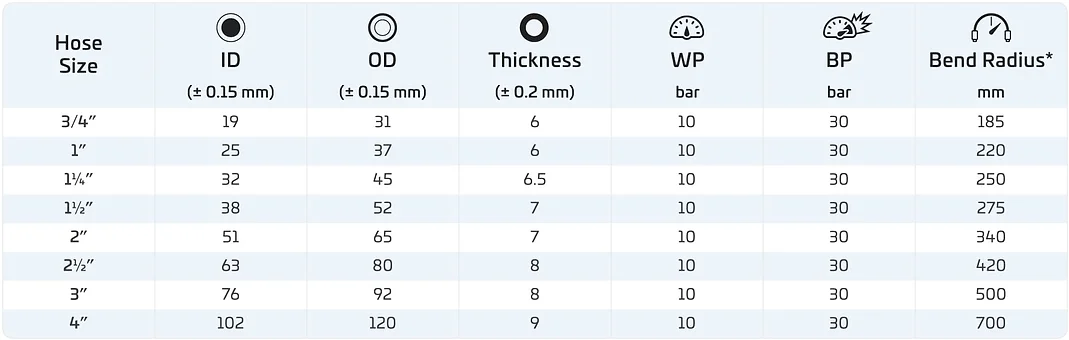 * Bend radius values are for outer smooth hoses with spiral steel wire reinforcements. Outer corrugated finish & discharge hoses have better flexing & bend radius.